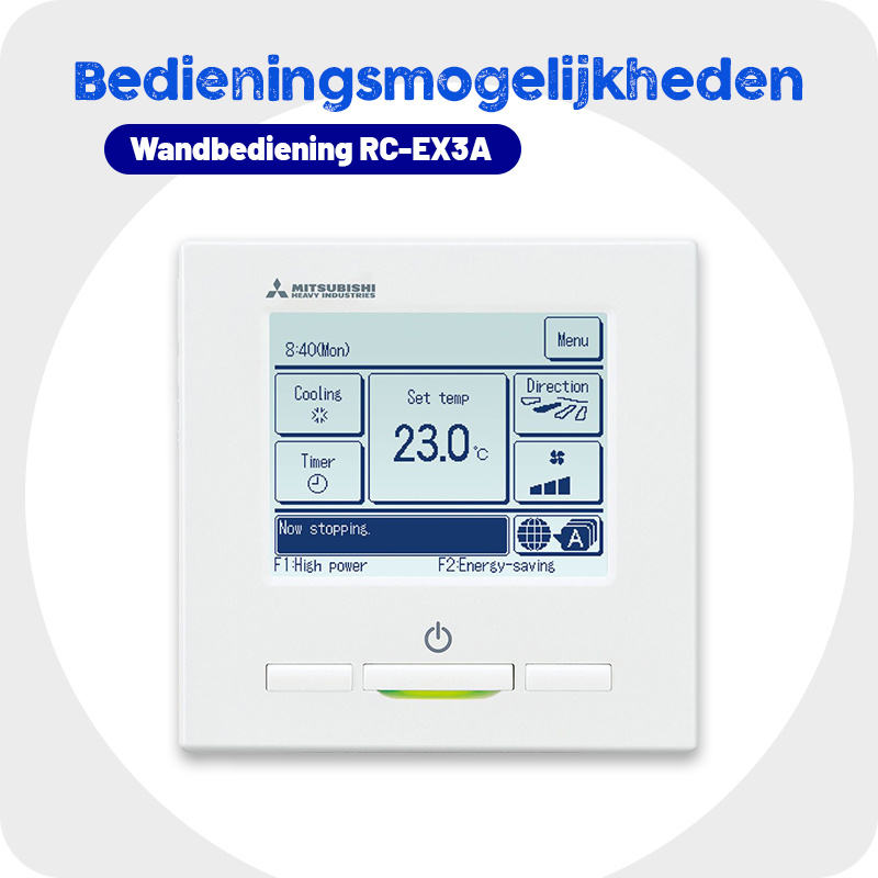 De cassette is te bedienen met een afstandsbediening of een wandbediening. Je kunt deze toevoegen bovenaan deze pagina, bij de optie "Wandbediening of Afstandsbediening?" De afstandsbediening wordt geleverd als een complete set met een infraroodontvanger in dezelfde kleur als het cassettepaneel. De wandbediening is bedraad en werkt met een afgeschermde stuurstroomkabel van 2x0,75 mm². Je hebt de keuze uit twee modellen: de EcoTouch RC-EX3A (wit) of de EcoTouch RC-ES1 (zwart).