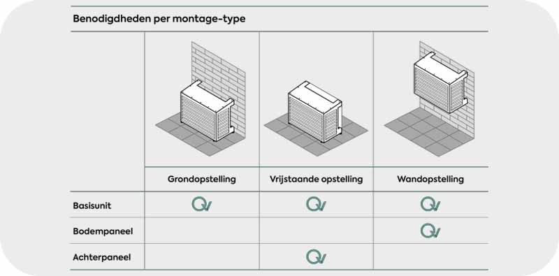 Een omkasting, kast of andere vormen van afwerking aan, op of om een airco- of warmtepomp-buitenunit kan altijd de werking en/of efficiëntie van de airco- of warmtepomp-buitenunit beïnvloeden en is derhalve geen reden tot retournering of omruiling.